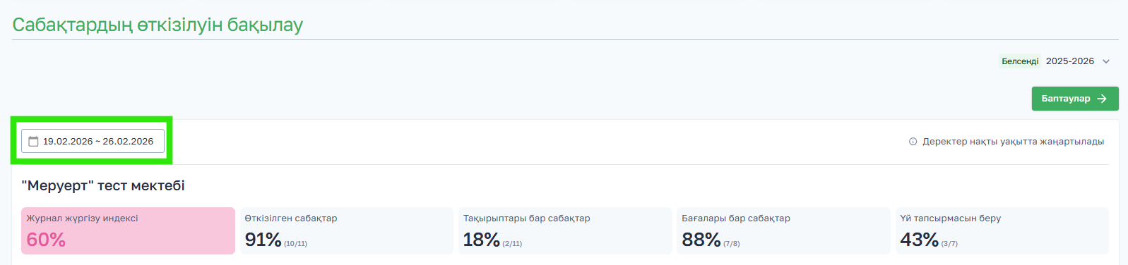 - Үй тапсырмасын беру — үй тапсырмасы берілген сабақтардың саны мен пайызы;