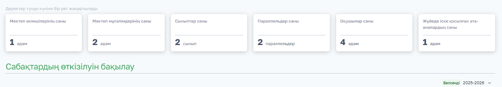 - Өткізілген сабақтар — өткізілген сабақтардың саны мен пайызы;