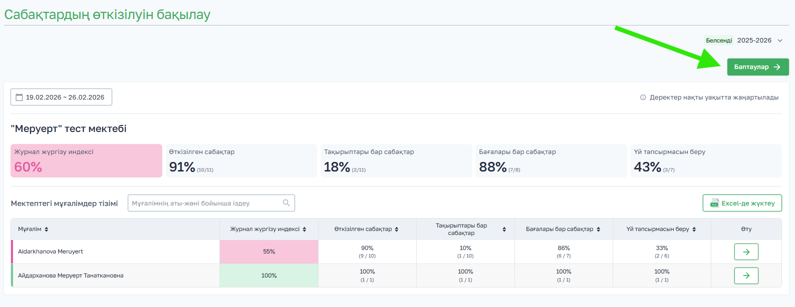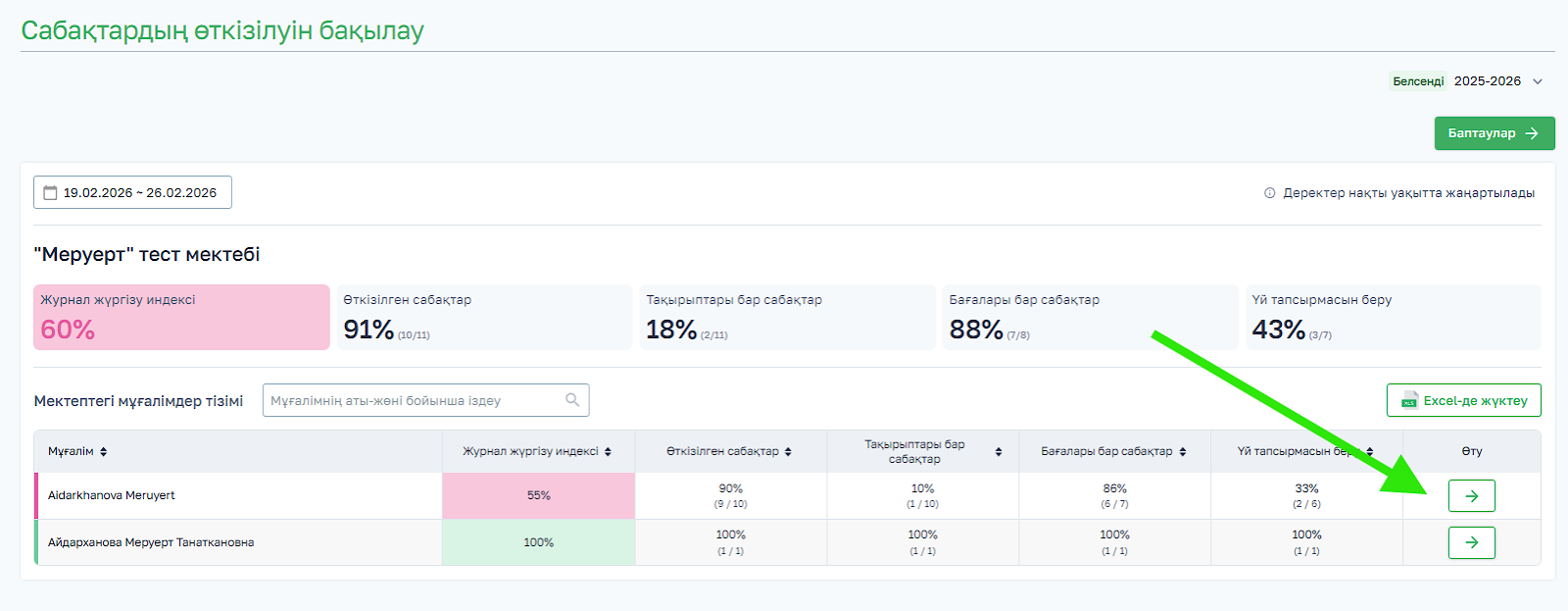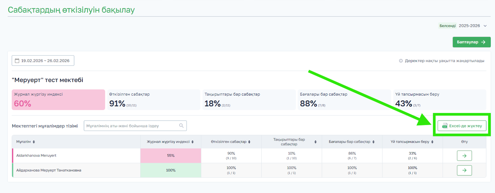 Мәліметтерді Excel форматында барлық мұғалімдер бойынша немесе белгілі бір мұғалім бойынша жүктеп алуға болады. Файлды жүктеу үшін Excel-ге жүктеу батырмасын басыңыз. Файл Excel форматында қолжетімді болады