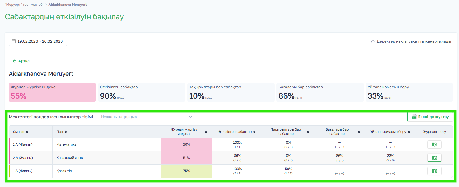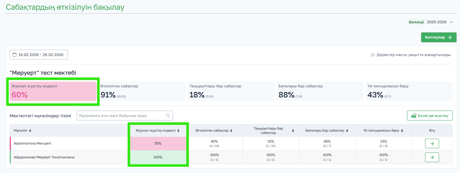 - Журнал жүргізу индексі — мұғалімнің таңдалған кезеңдегі жалпы көрсеткіші;