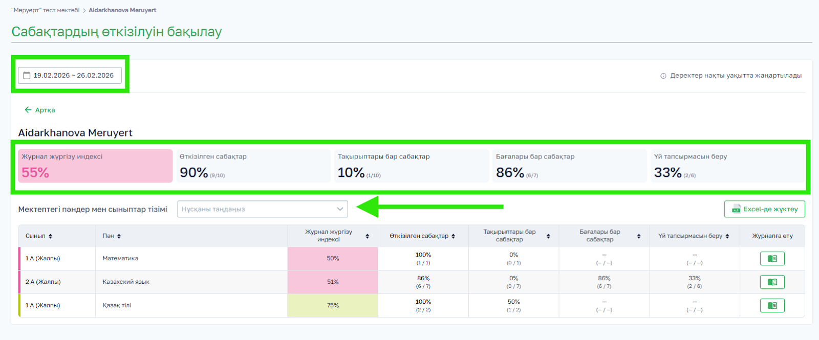 - Бағалары бар сабақтар — мұғалім бағаларды қойған сабақтардың саны мен пайызы;