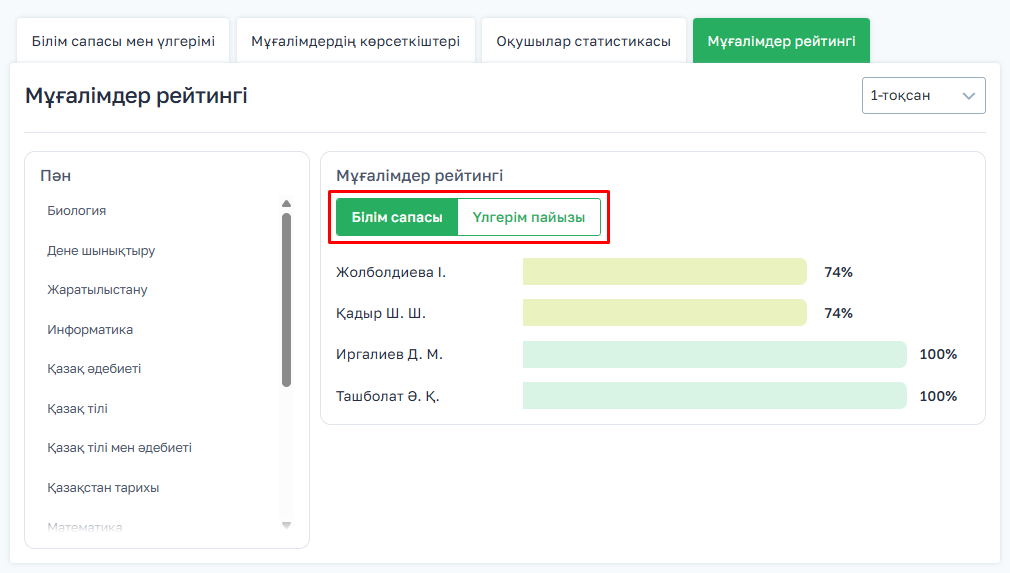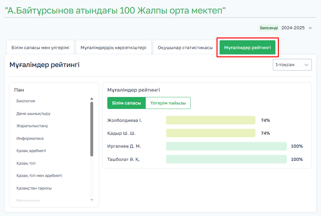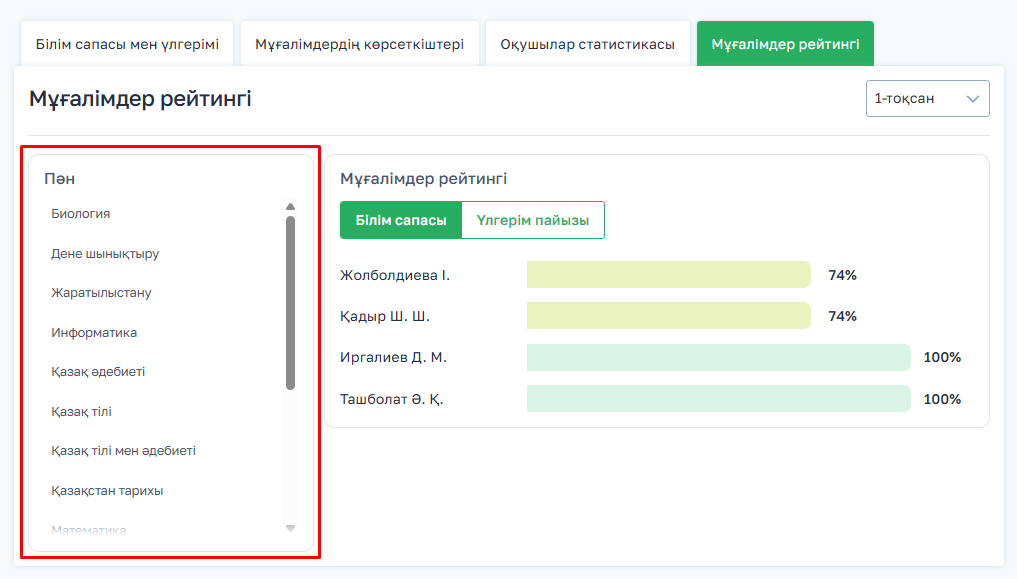 Мысалы: егер «Жаратылыстану» пәнін таңдасаңыз, жүйе осы пәнді оқытқан барлық мұғалімдердің тізімін және олардың көрсеткіштерін көрсетеді.