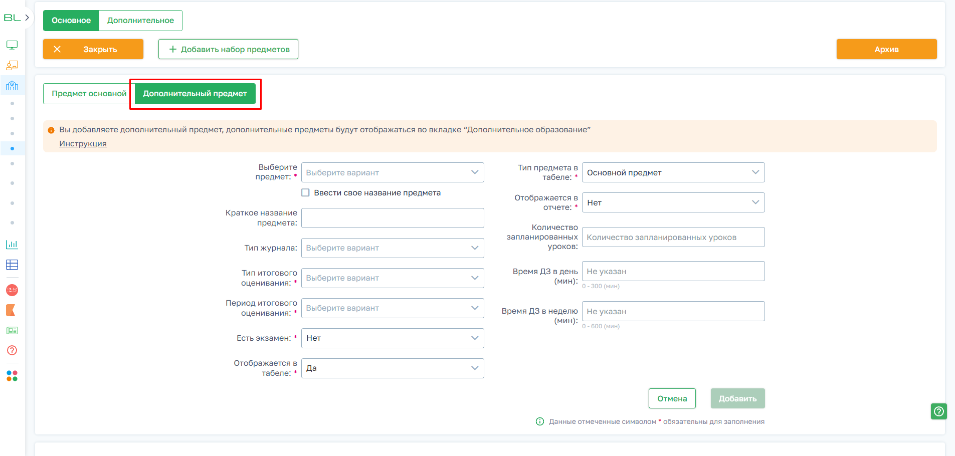 4. В открывшемся окне выберите вкладку «Дополнительный предмет» (по умолчанию открыта вкладка «Предмет основной»).