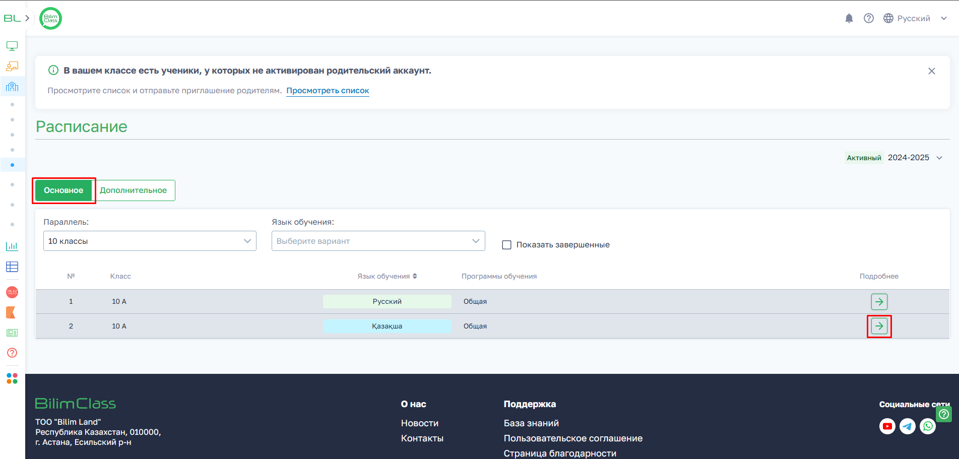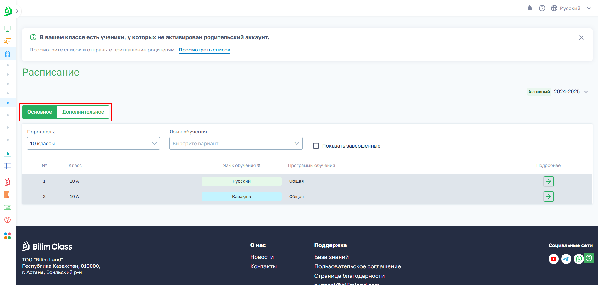 - Во вкладке «Основное» будут отображаться предметы классов, добавленные как основные.