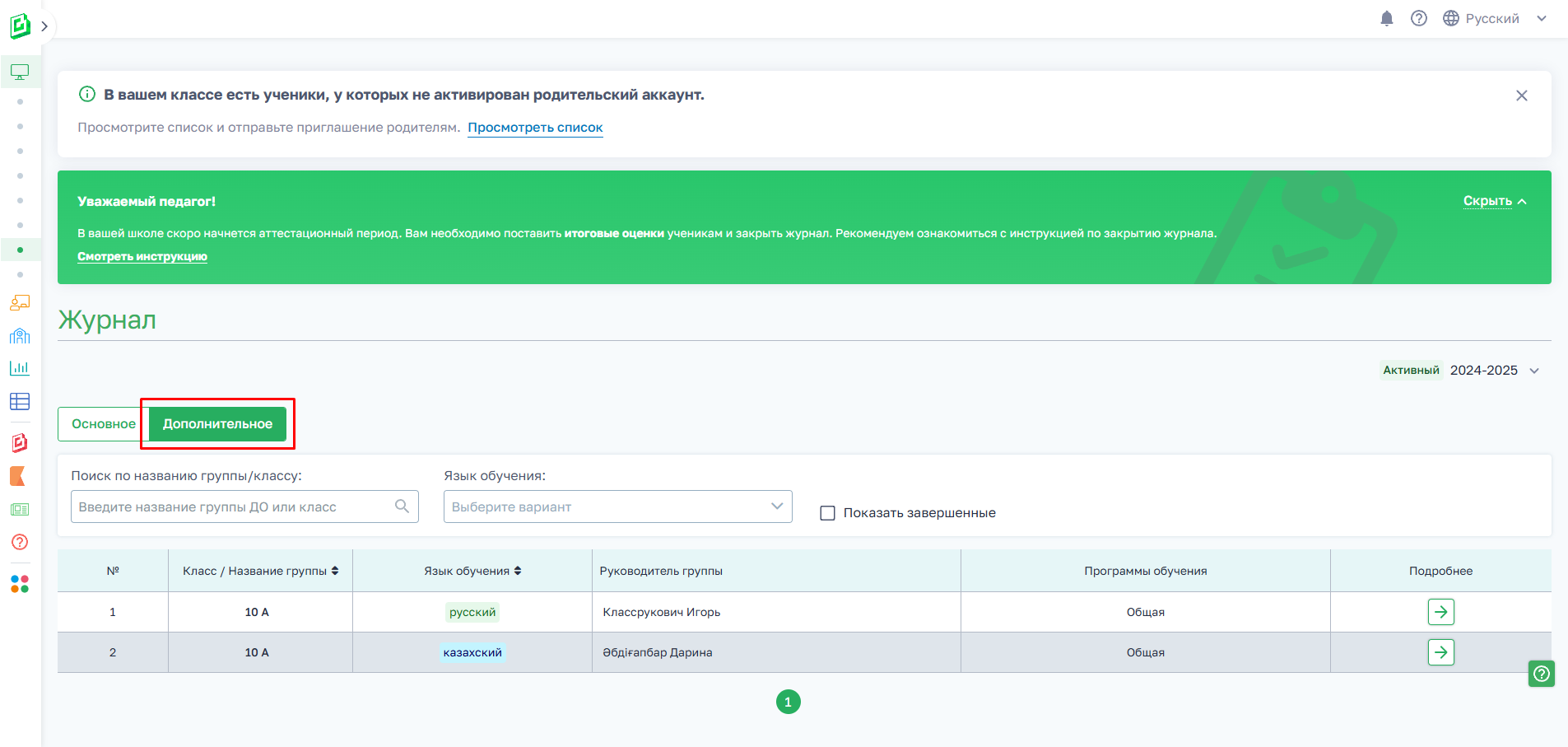Примечание! Если у класса есть и журнал по основным предметам, и журнал по ДО, то этот класс будет отображаться в обеих вкладках.