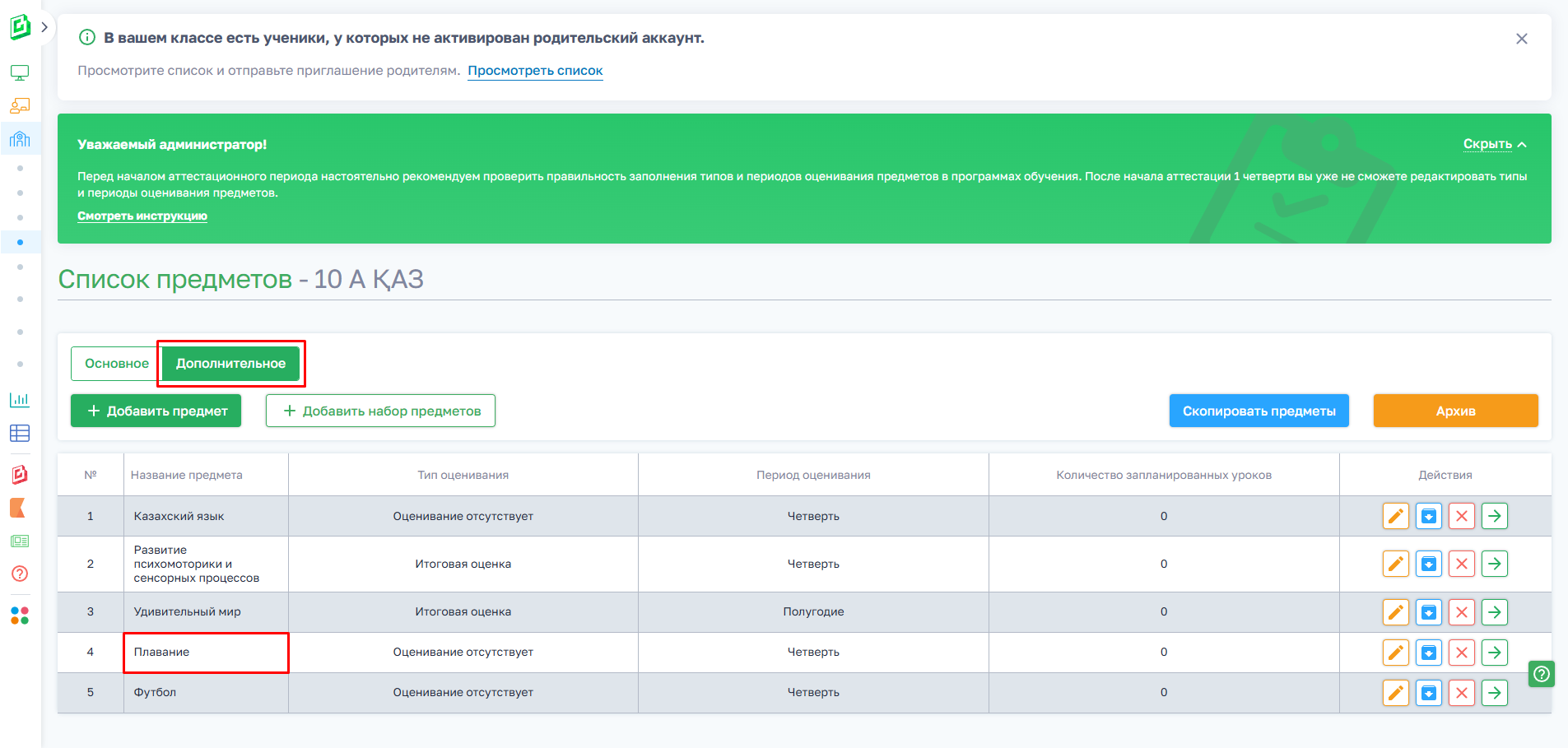 7. В списке предметов отобразятся и основные предметы класса, и предметы ДО, которые были добавлены в программу обучения.