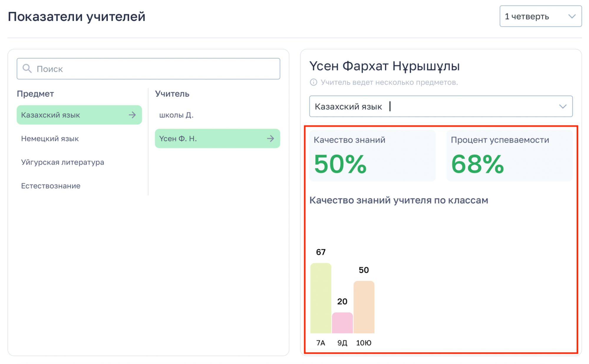 Здесь можно увидеть качество знаний, процент успеваемости и детальную статистику по каждому классу, где ведёт данный учитель.