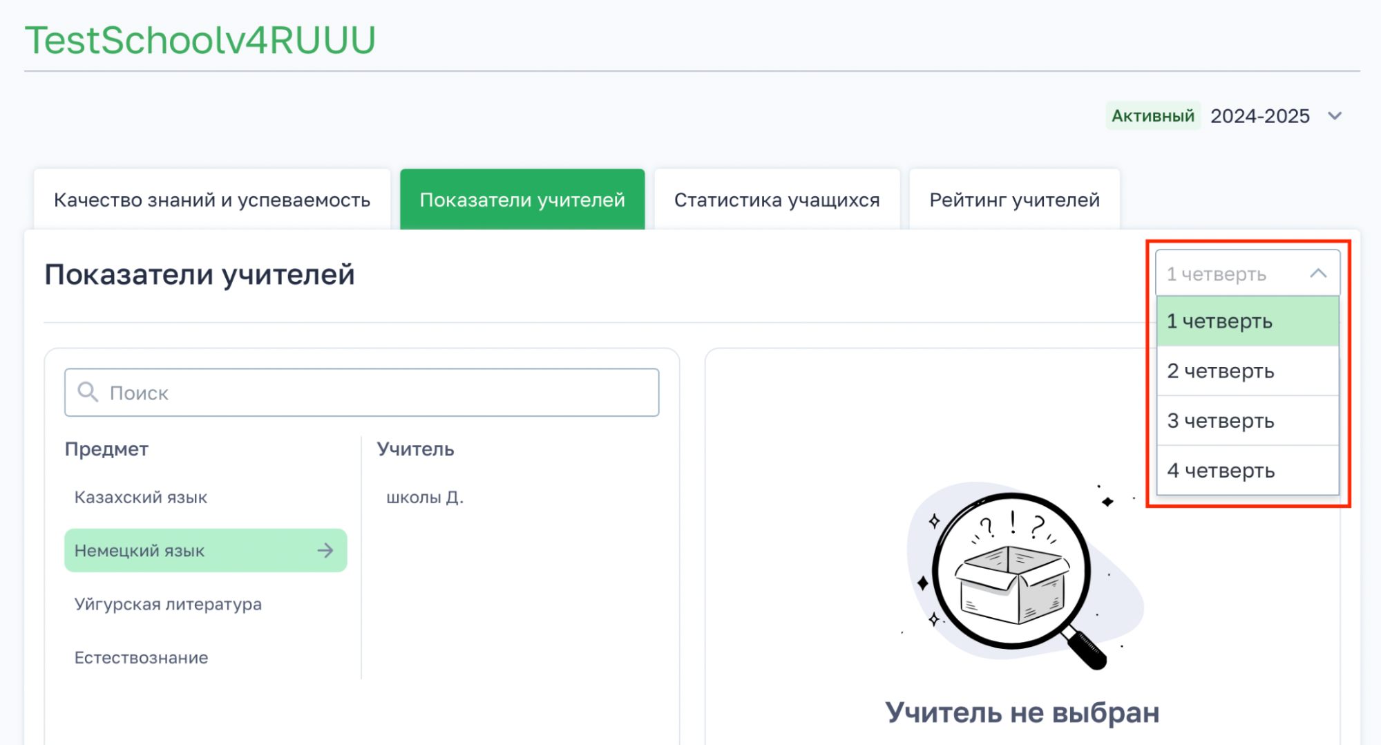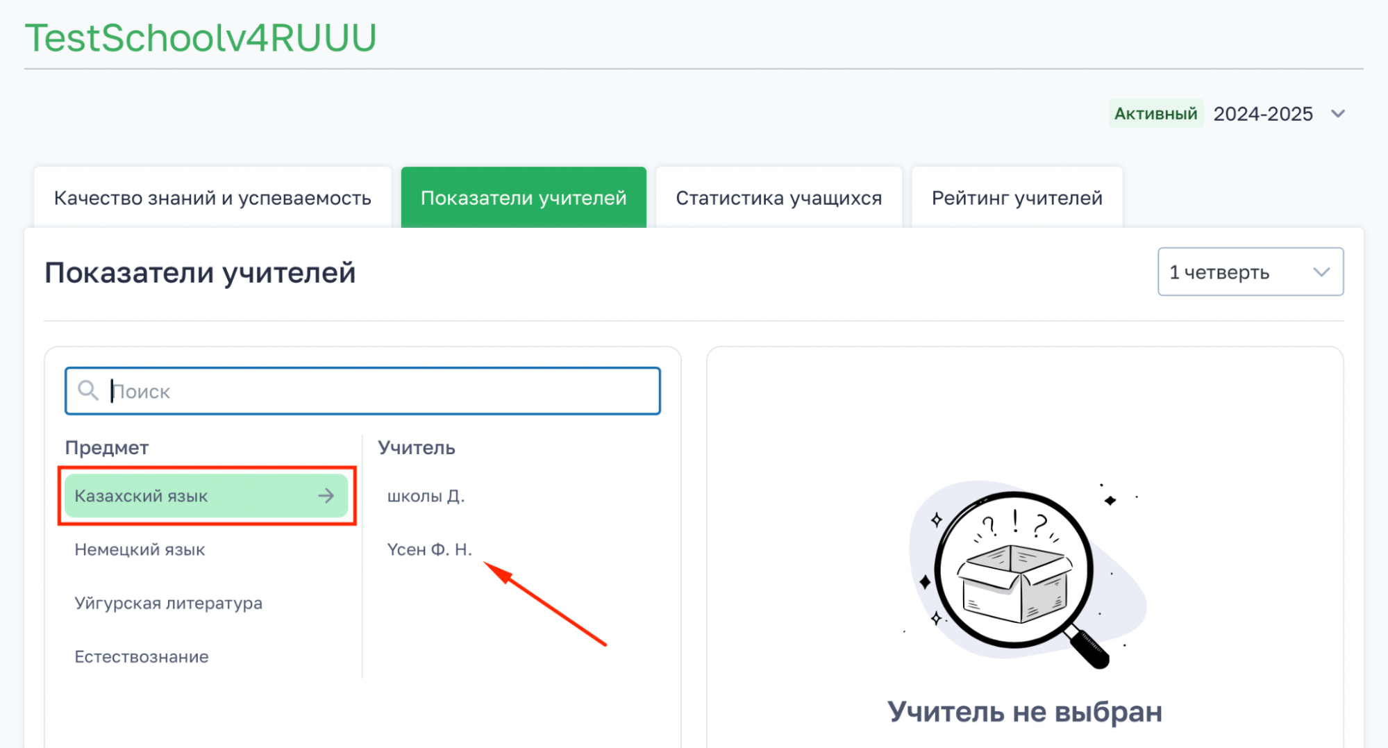 - Нажмите на ФИО учителя — откроется блок с показателями по этому учителю.