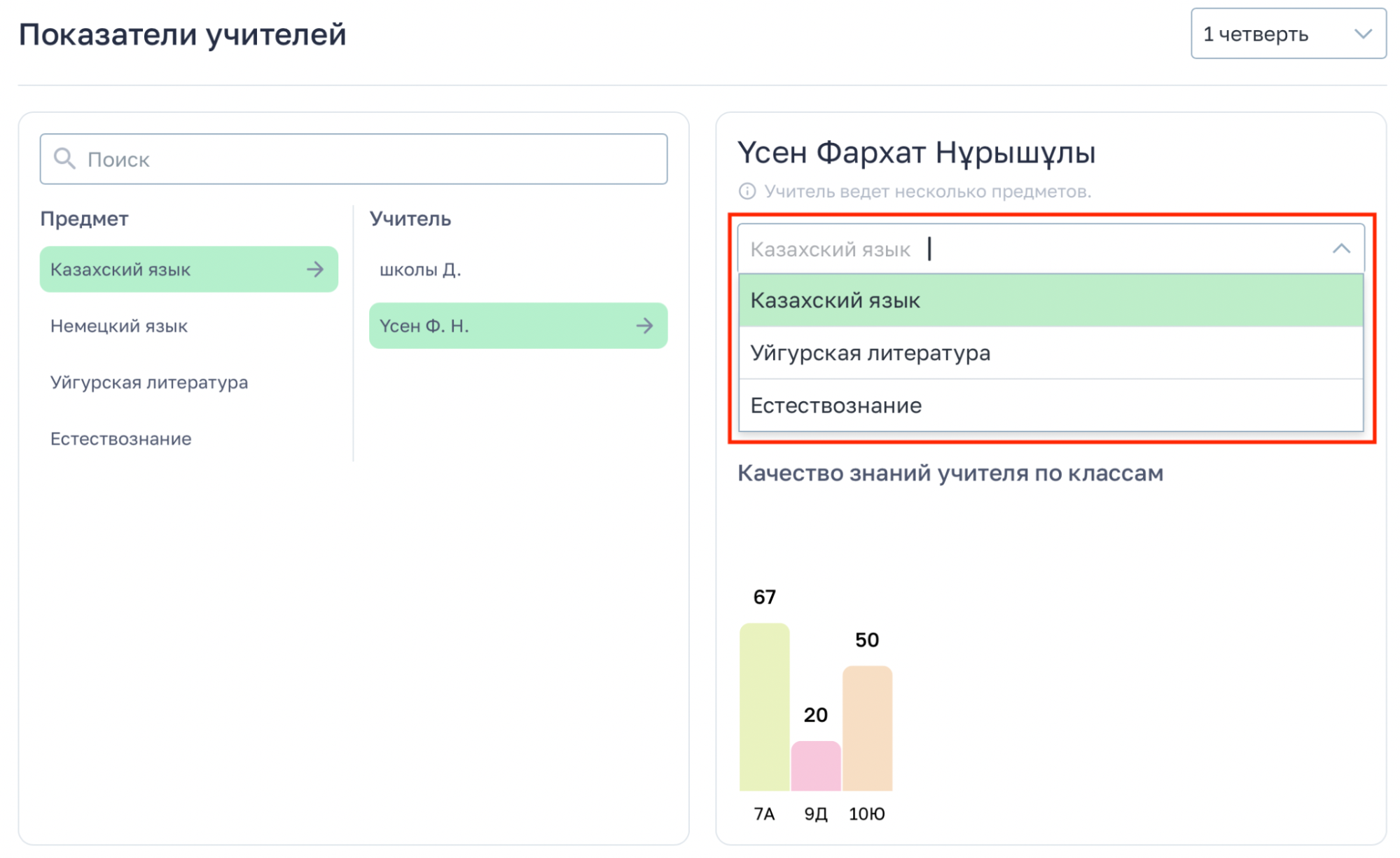 Если учитель ведёт несколько предметов, над таблицей появятся переключатели предметов.