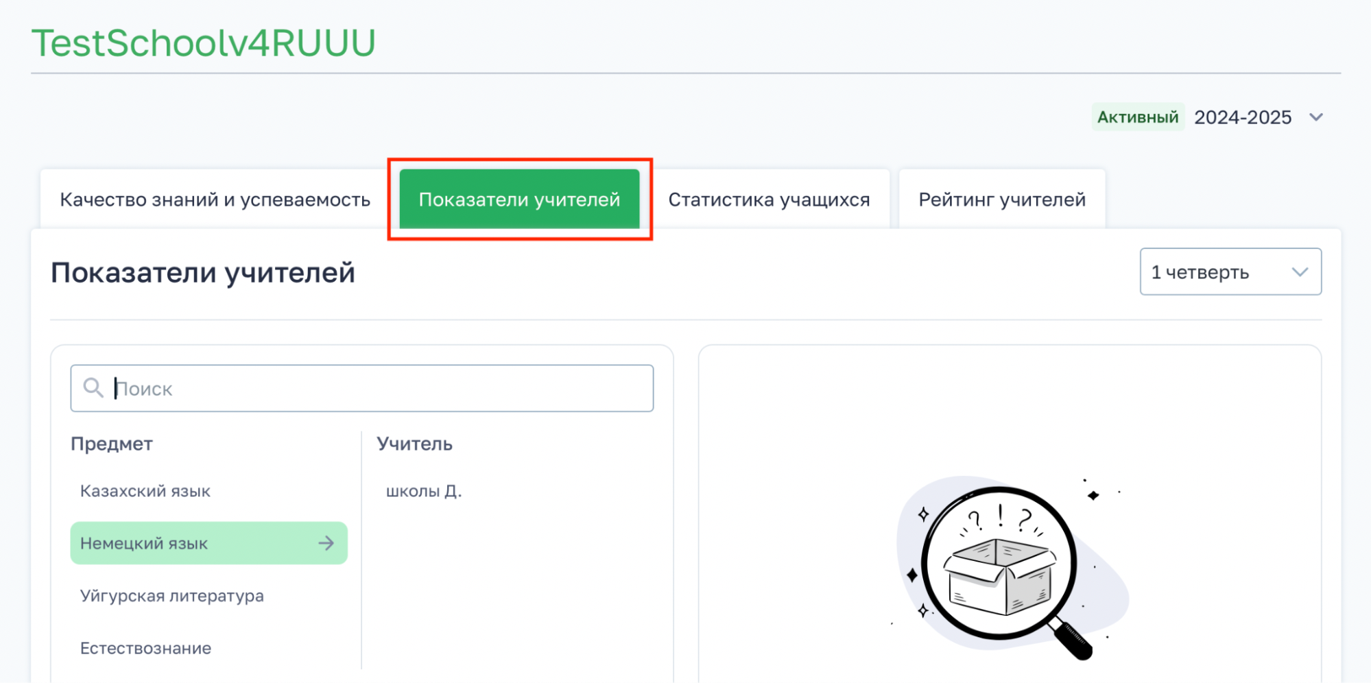 Вкладка «Показатели учителей» позволяет просматривать статистику работы педагогов по каждому предмету за выбранный период.