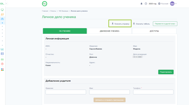 5) У вас открылось Личное дело ученика. Нажимаем на кнопку Скачать справку