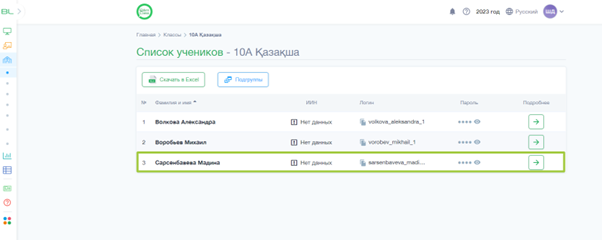 4) В списке выбираем необходимого ученика, вдоль его строки нажимаем на стрелку в столбце Подробнее