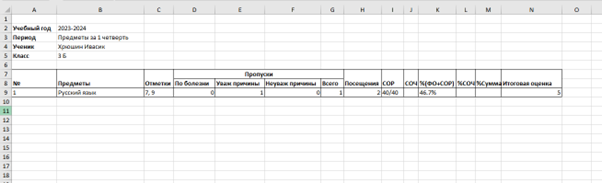У вас откроется Excel файл со всеми оценками за выбранный период. Названием файла по умолчанию станет ФИО ученика и выбранный период. Ищите файл в Загрузках или Последних скачиваниях браузера.