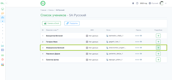 4. В списке учеников выбираем необходимого ученика и нажимаем на стрелку в столбце Подробнее