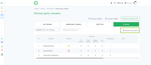 Во вкладке Оценки Личного дела ученика, сделайте фильтрацию периода. После, нажмите на кнопку Скачать все оценки.