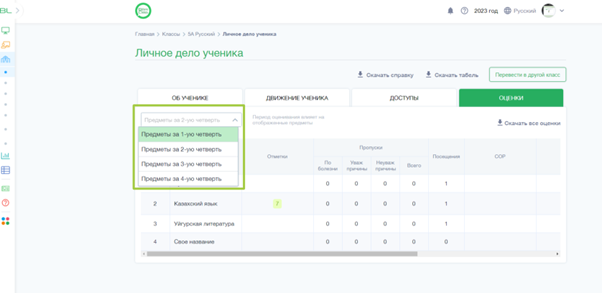 Примечание! Четвертные предметы будут отображаться в четвертях. Полугодовые предметы будут отображаться в полугодиях. К примеру, при выборе четверти, полугодовые предметы отображаться в списке не будут.