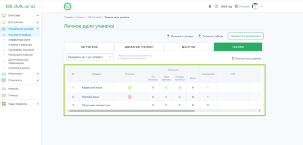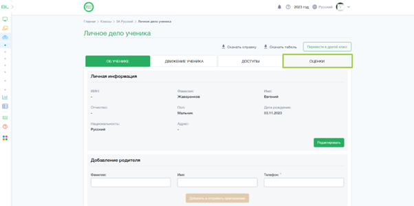 5. В личном деле ученика нажмите на вкладку Оценки