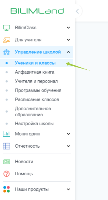 1. Левое меню → Управление школой → Ученики и классы