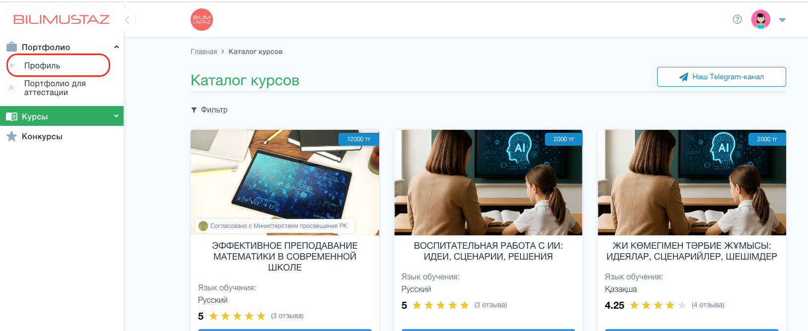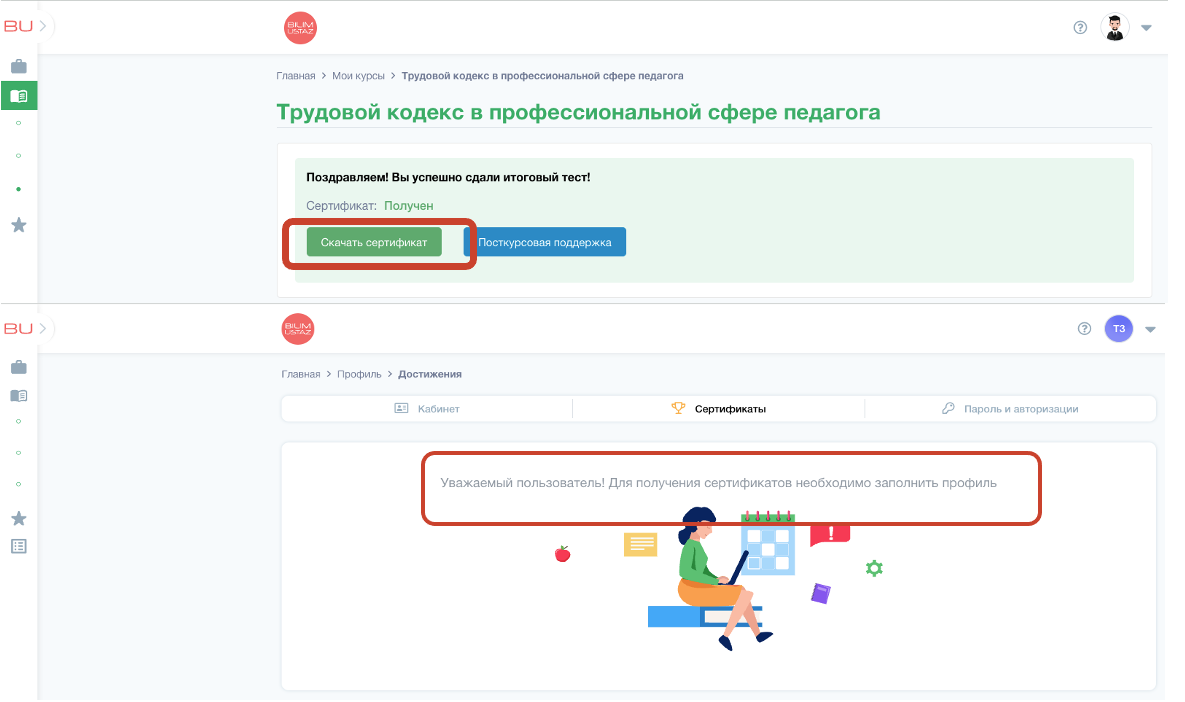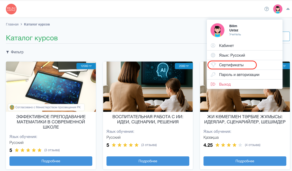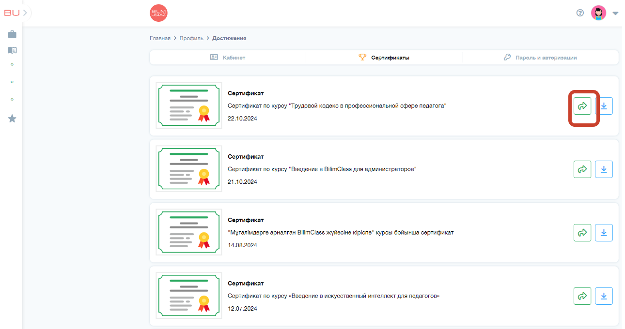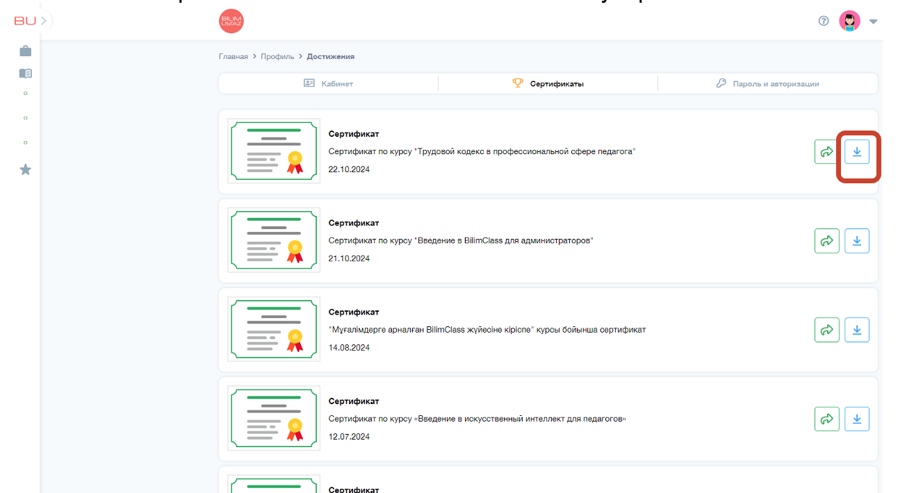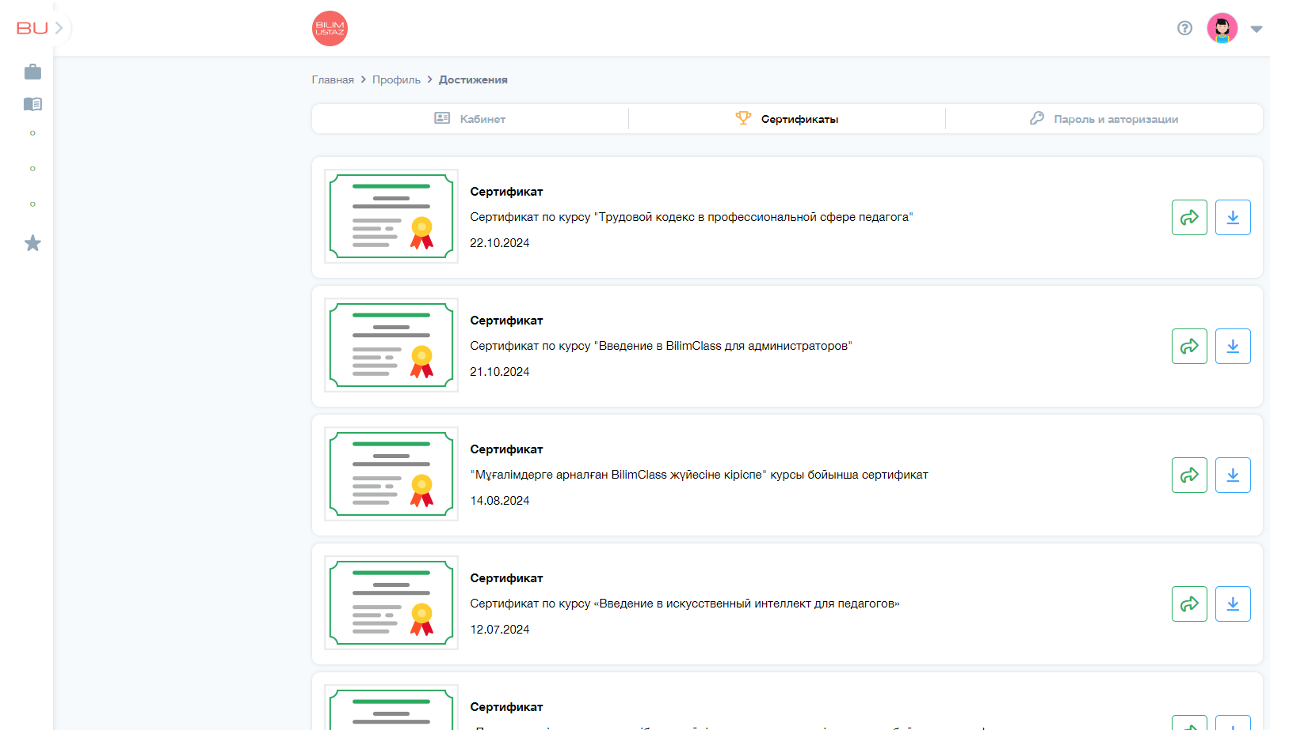 3. В разделе «Сертификаты» находятся все сертификаты, полученные вами в процессе обучения на платформе BilimUstaz. Чтобы обновить список и увидеть новые сертификаты, рекомендуется обновить страницу.