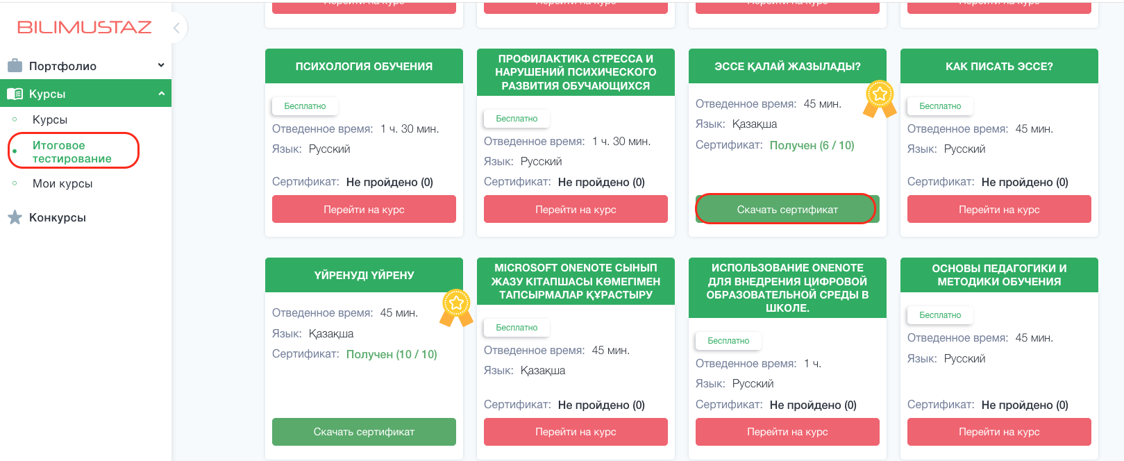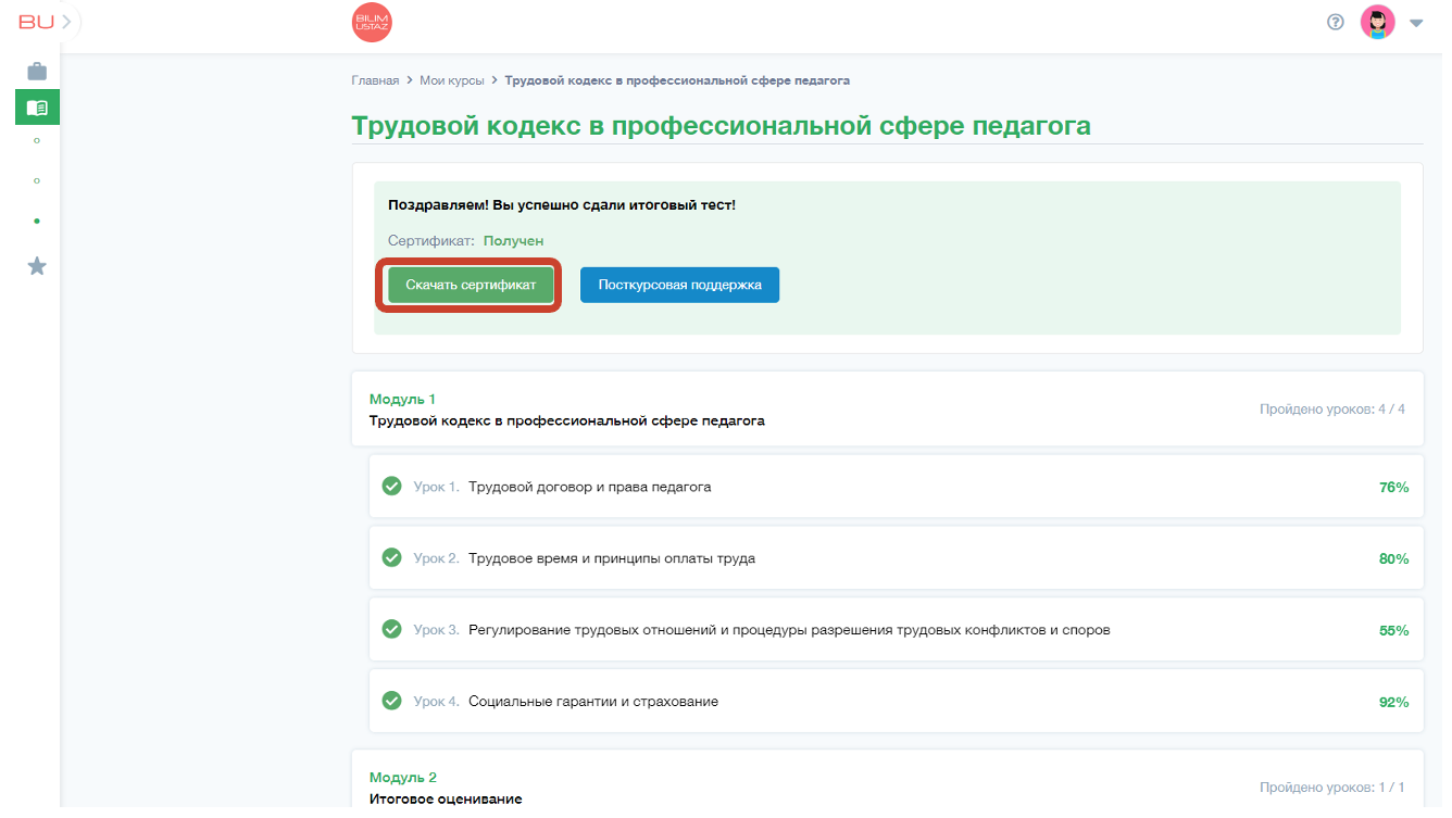 После успешного завершения тестирования по курсам вам будет предоставлен сертификат. Чтобы завершить процесс и получить сертификат, выполните следующие шаги: