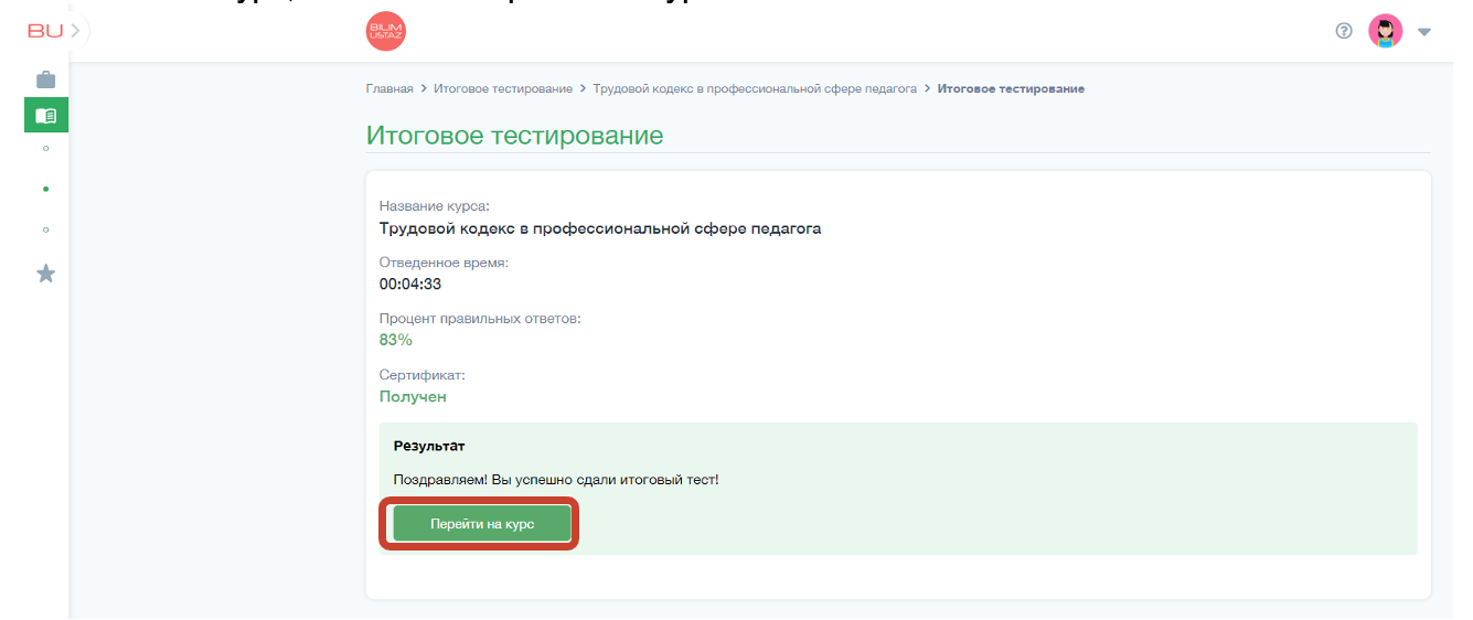 После завершения тестирования на экране появится уведомление об успешной сдаче итогового теста. Чтобы получить сертификат и вернуться на курс, нажмите «Перейти на курс».