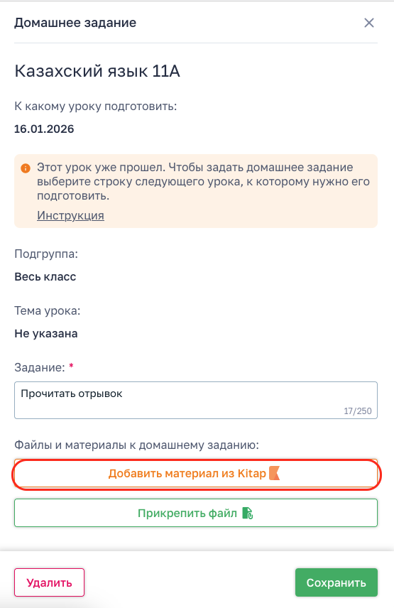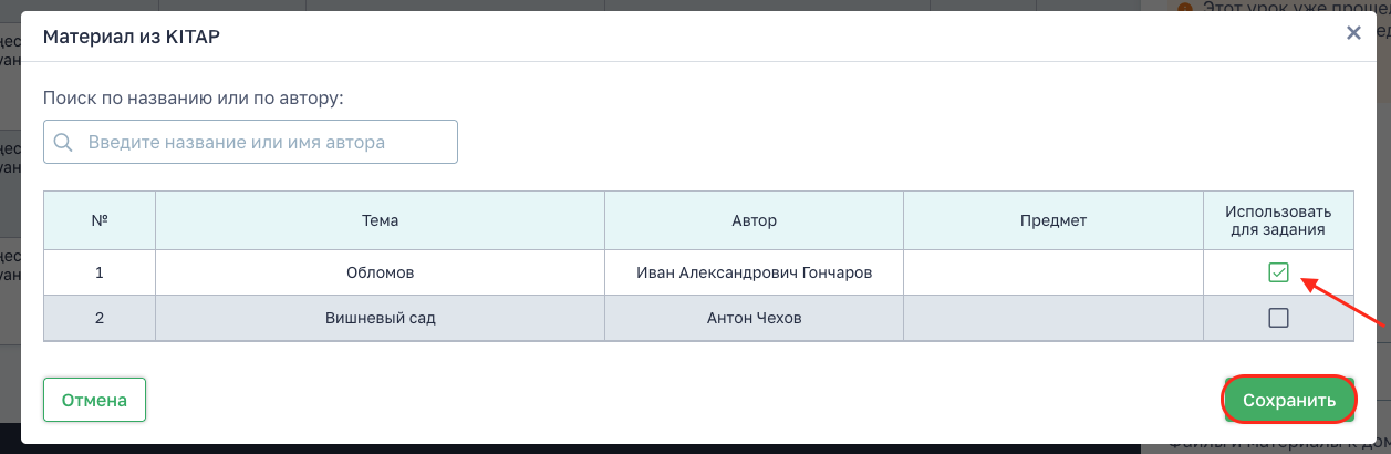 8. В окне нажмите на кнопку Добавить материал из Kitap