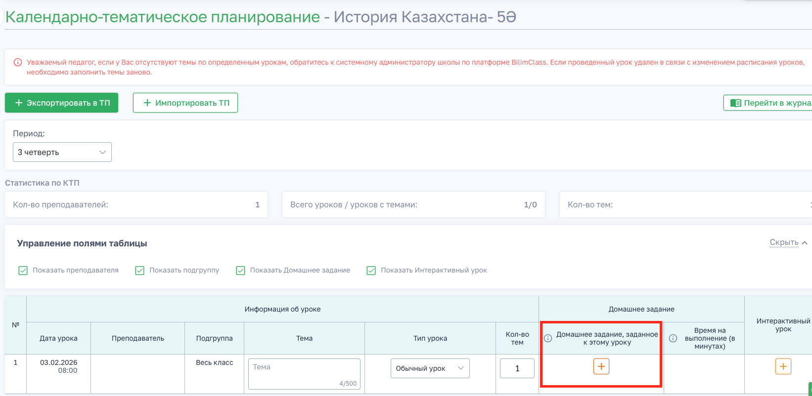 5. В разделе Домашнее задание нажмите на значок плюса (+)
