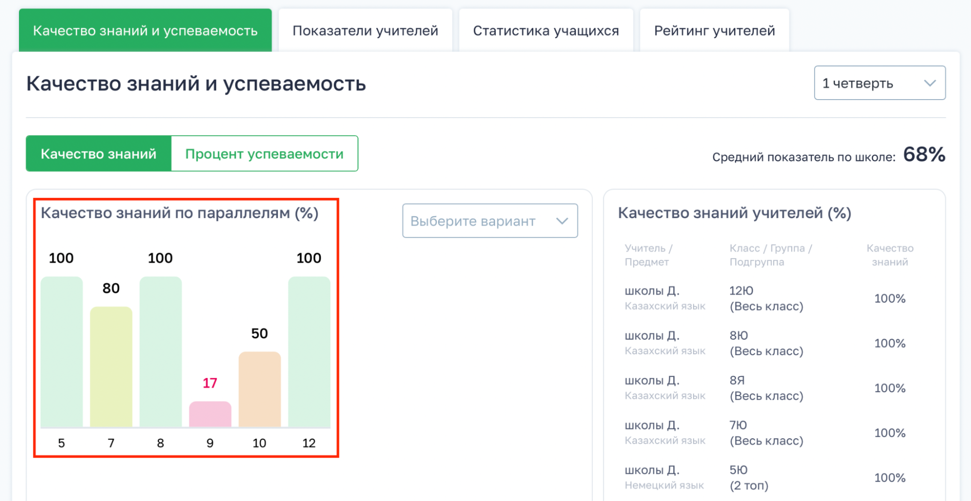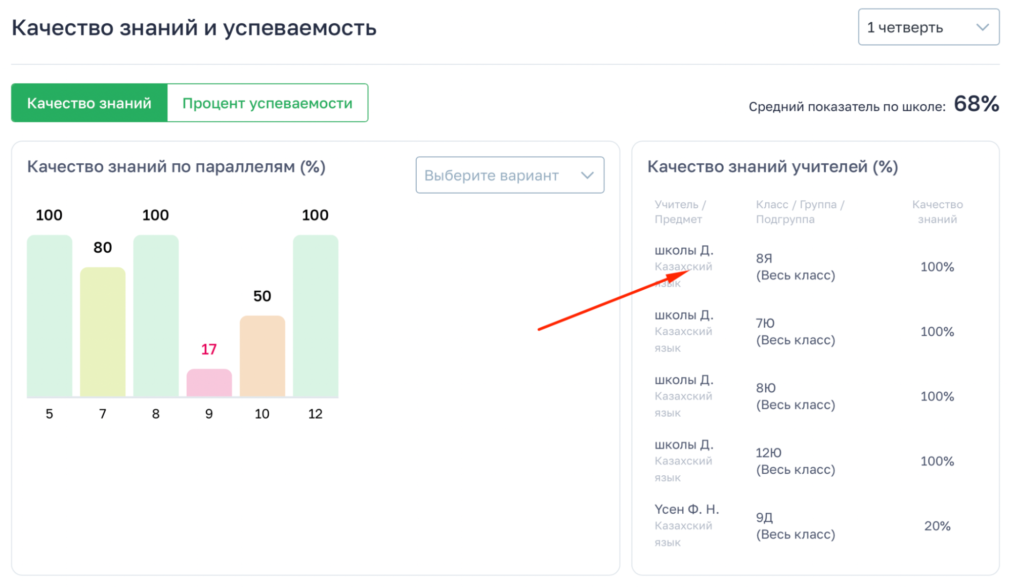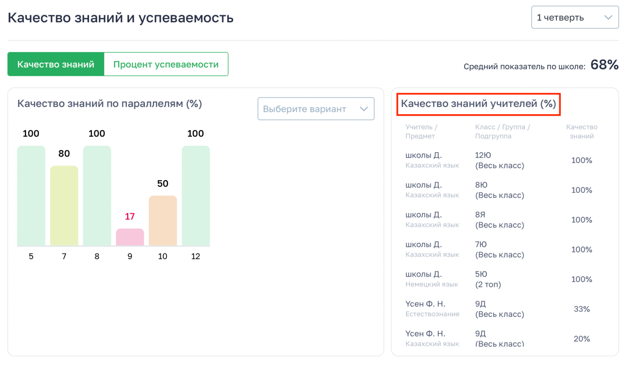 - Если выбрать параллель или литеру в блоке “Качество знаний по параллелям (%)” — отображаются только учителя, работающие в выбранных классах.