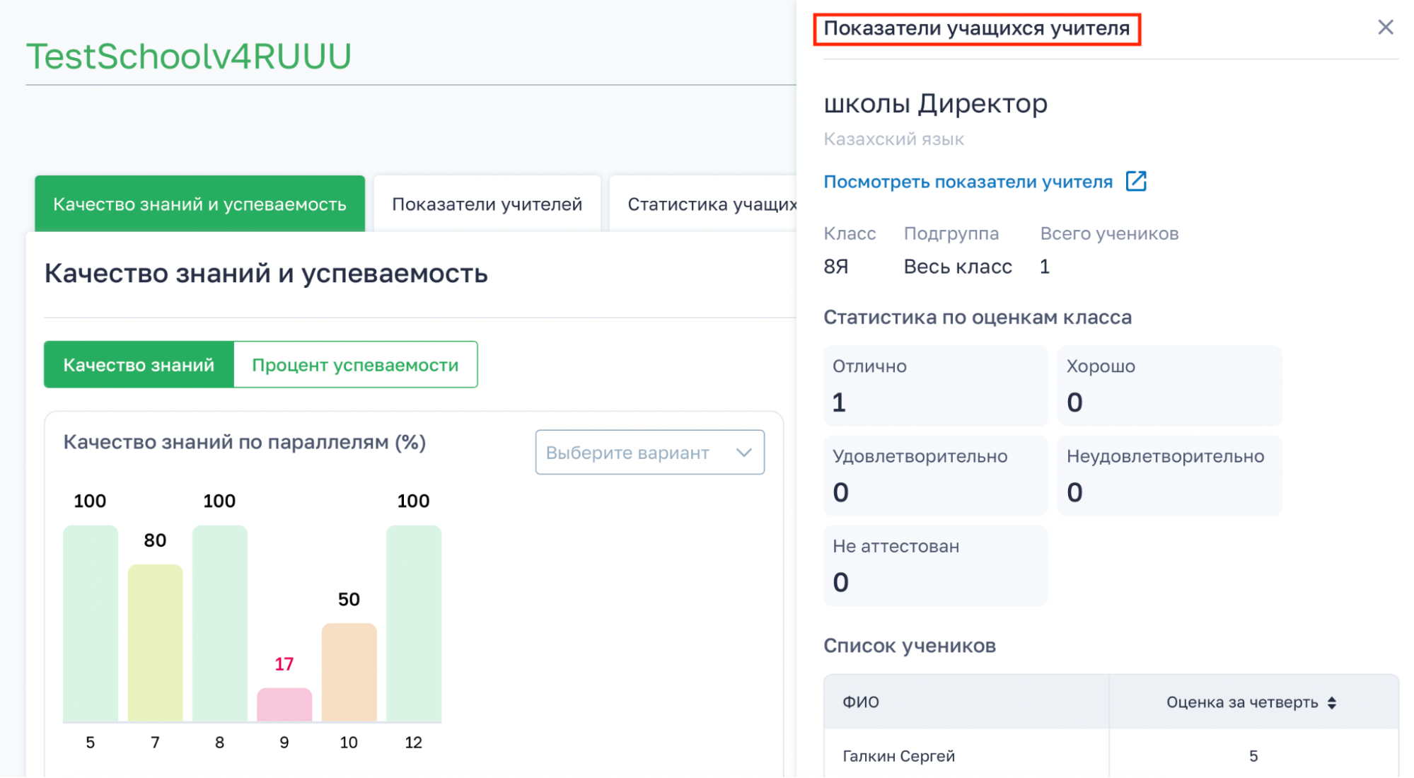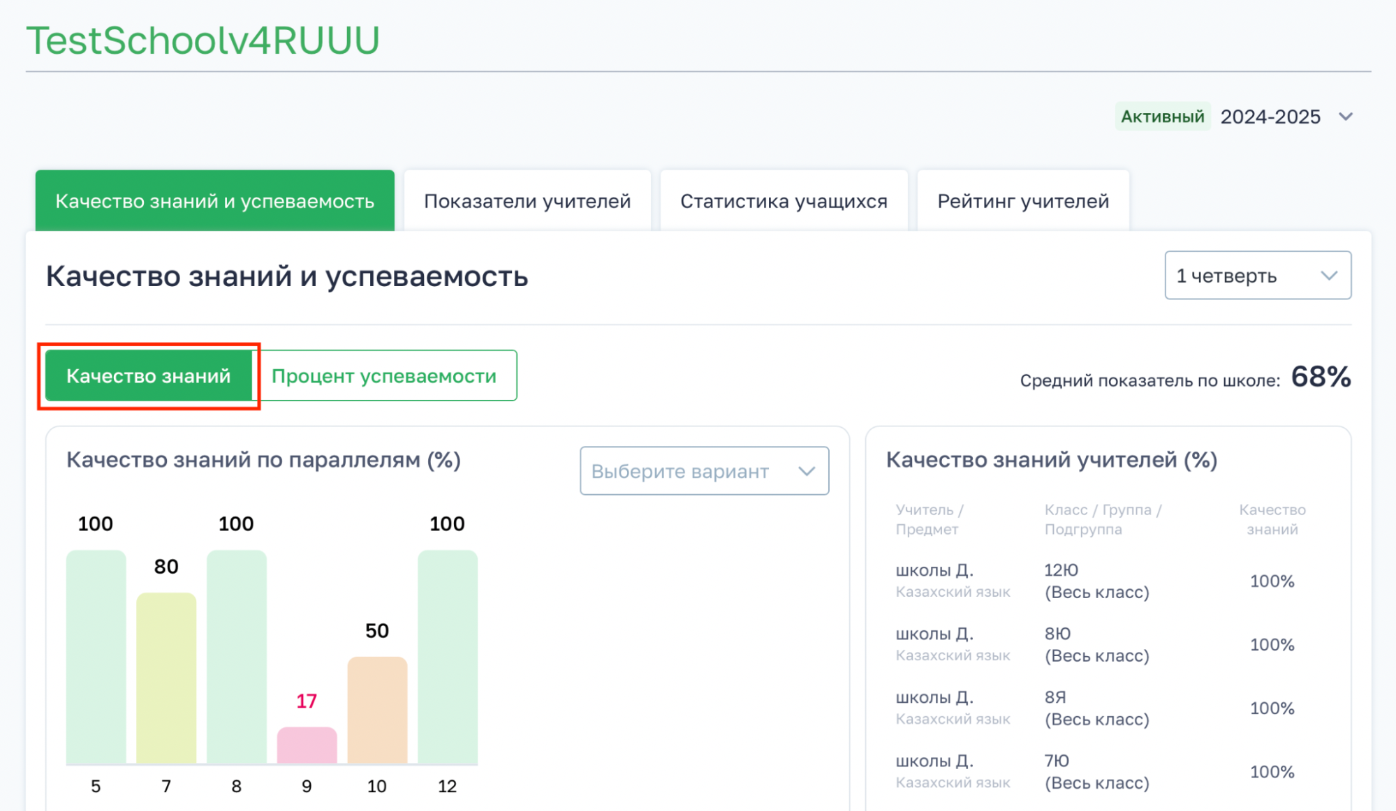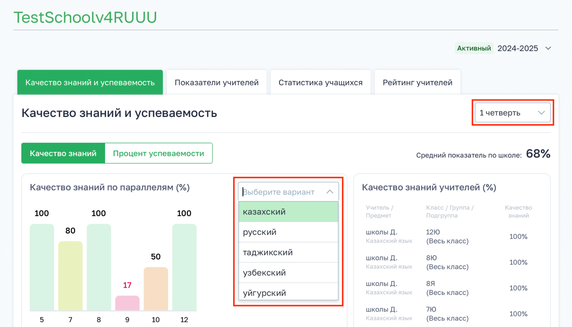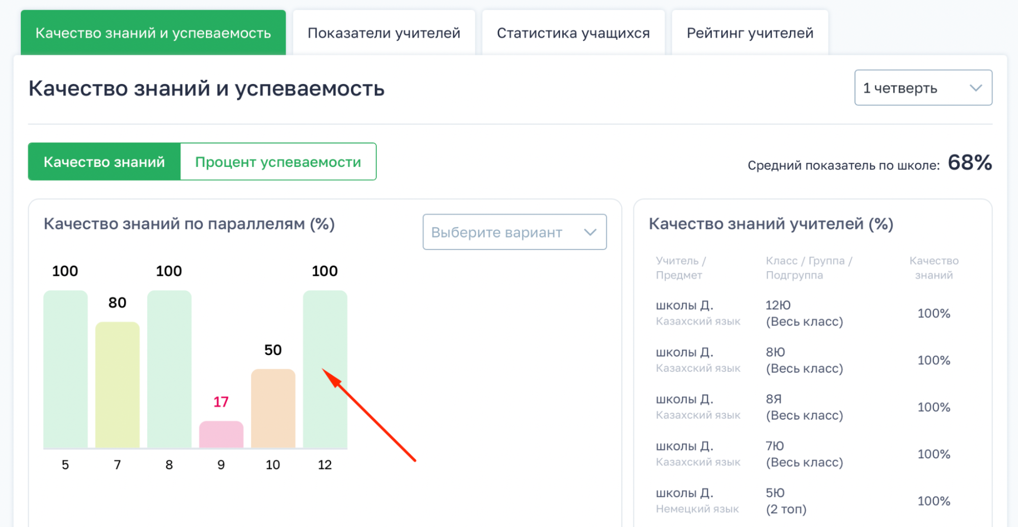 - Если выбрать параллель или литеру в блоке “Качество знаний по параллелям (%)” — отображаются только учителя, работающие в выбранных классах.