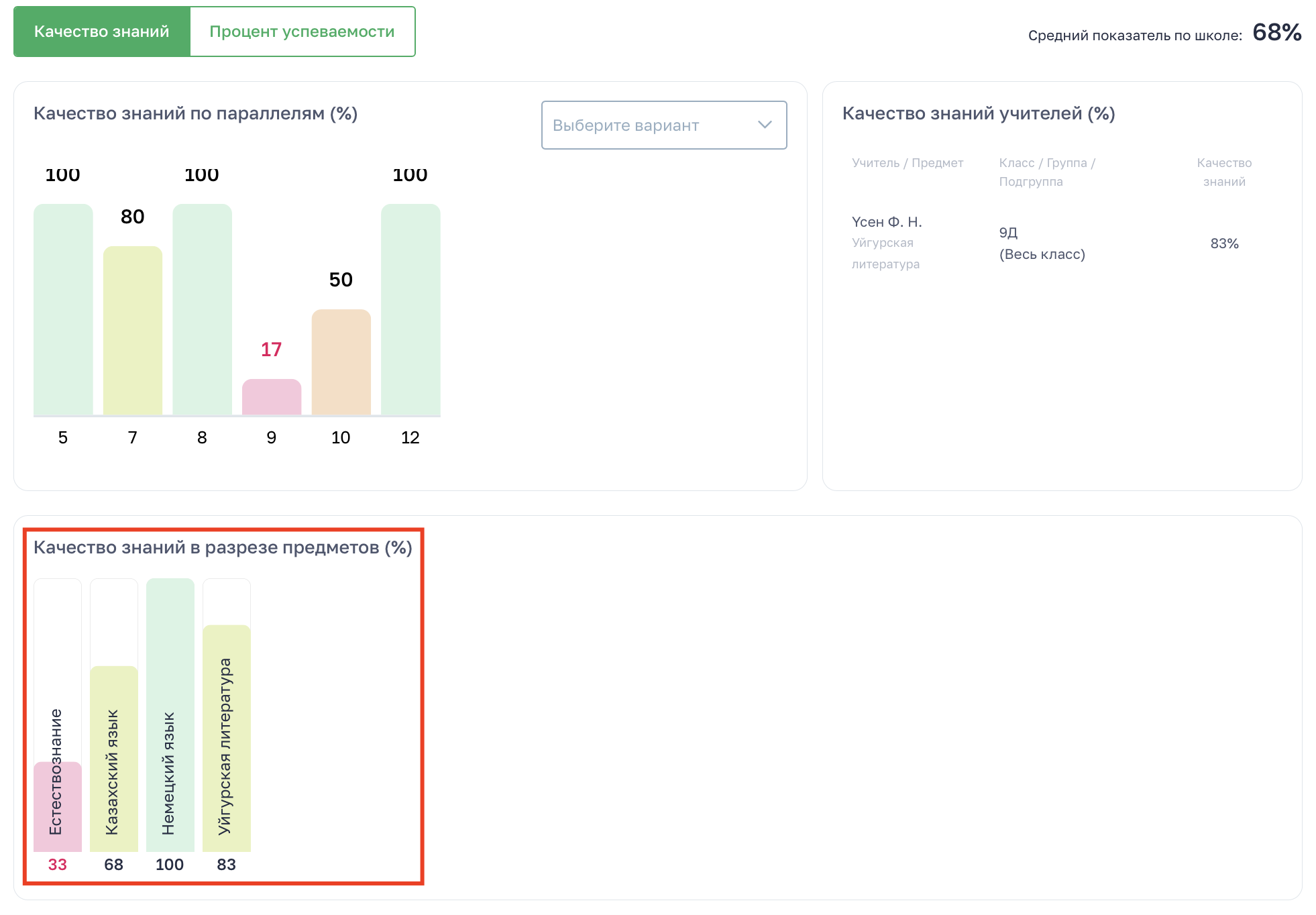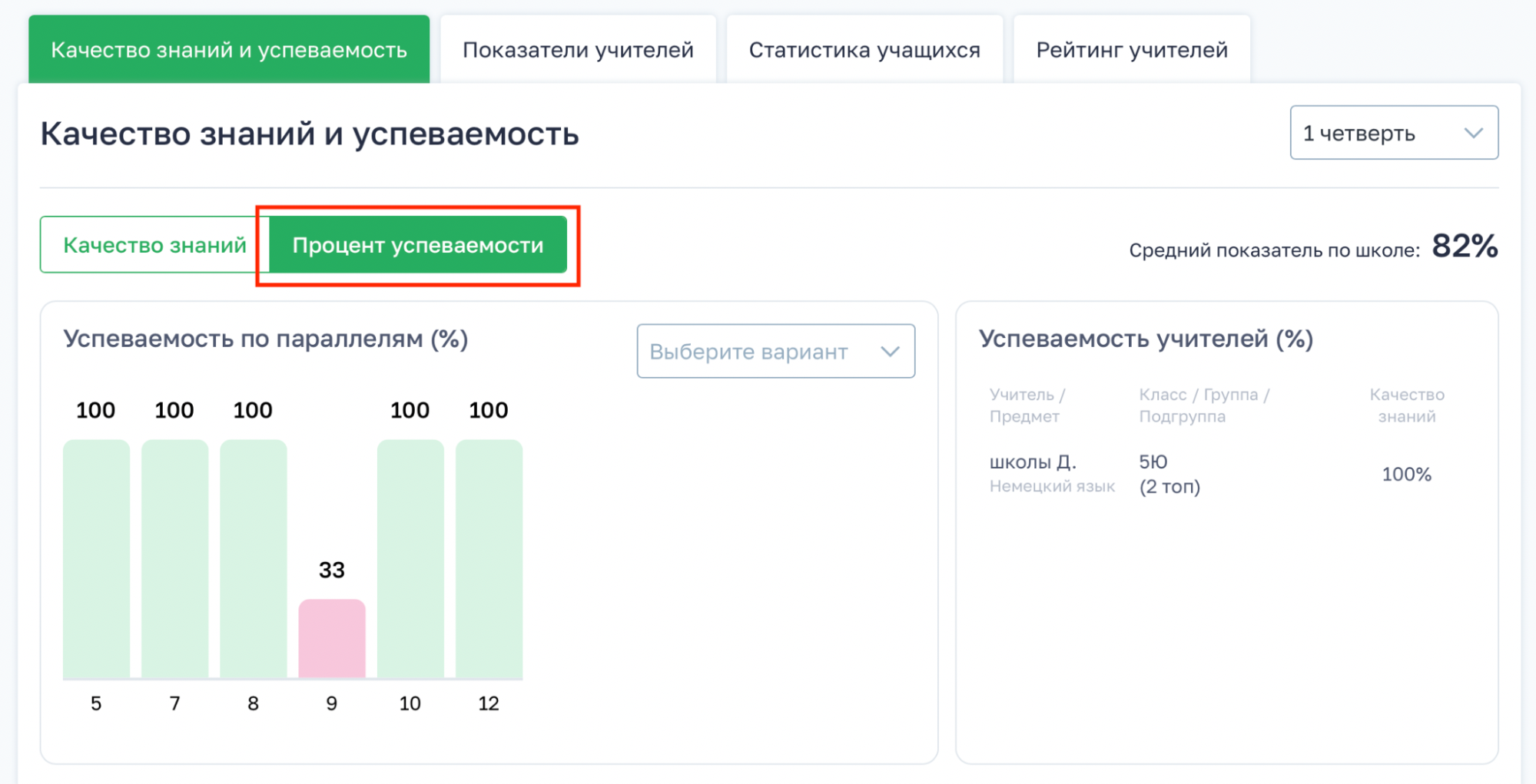 Эта под-вкладка работает аналогично «Качеству знаний», но показывает общий процент успеваемости.