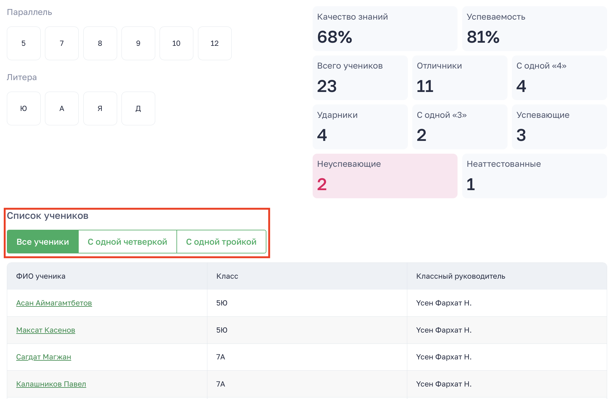 Здесь отображаются общие показатели успеваемости, качество знаний по параллелям и классам, а также список учеников с возможностью фильтрации по их результатам.