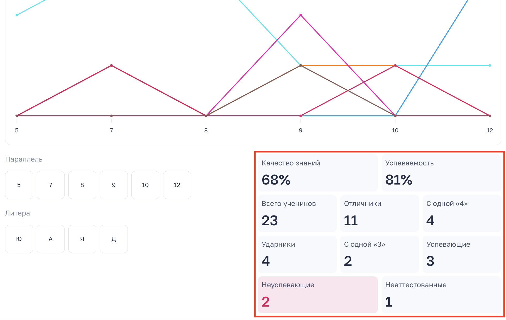 После выбора литера отображается статистика только по выбранному классу.