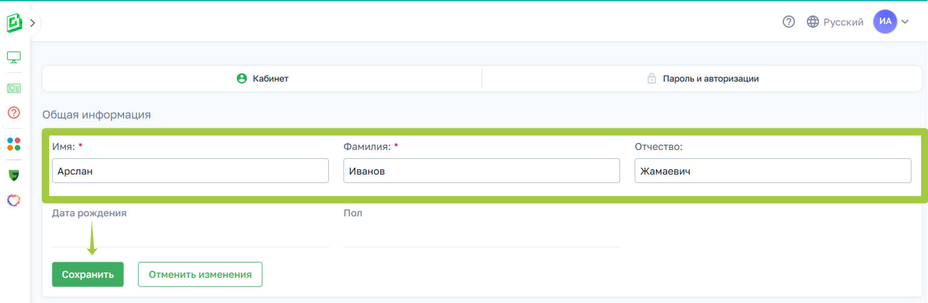 - Внесите изменения в поля «Имя», «Фамилия», «Отчество» (обязательные поля отмечены *).