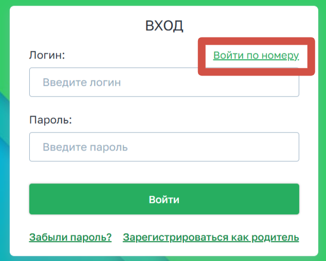 - Вход в личный кабинет родителя осуществляется по номеру телефона, зарегистрированному в системе.
