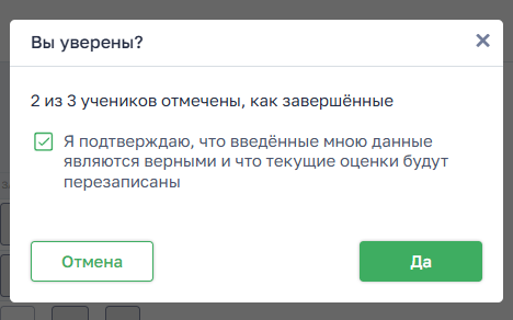 - чекбокс: «Я подтверждаю, что введённые мною данные являются верными и текущие оценки будут перезаписаны»